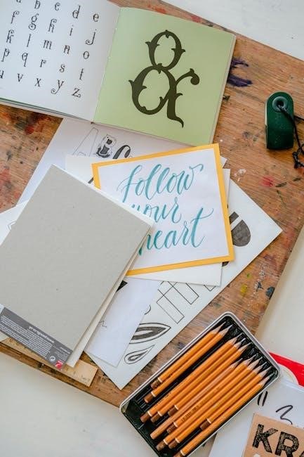 Calligraphy guide sheets are essential tools for mastering lettering, providing templates for consistent spacing, alignment, and style. They help beginners and professionals alike achieve precise strokes and uniformity. Use with ink, nibs, and paper for best results.